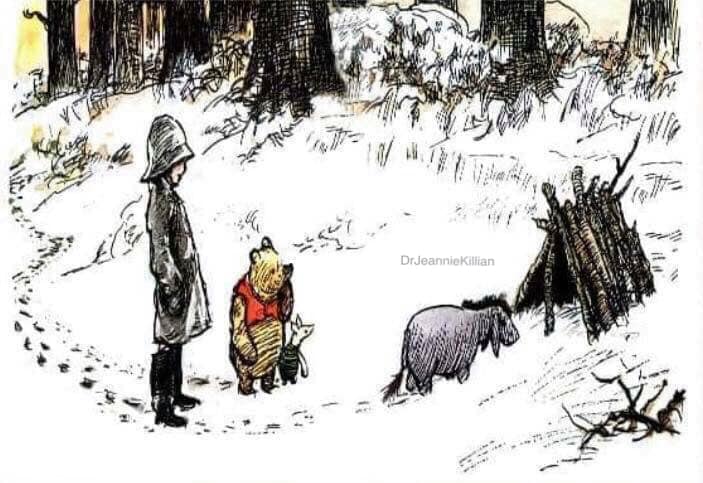 “Oh,” said Eeyore. “Oh.” And the three of them sat there in silence, and while Pooh and Piglet said nothing at all; somehow, almost imperceptibly, Eeyore started to feel a very tiny little bit better.