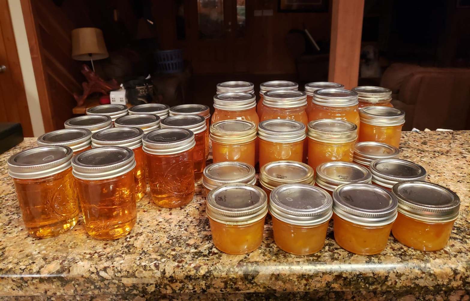 Yesterday, we went to the grocery store to buy some Sure-Jell pectin. I’ve always used the Sure-Jell powder to make jelly or jam, but this was not to be found. I had a bucket full of fresh picked crab apples for jelly and a sink full of quart bags full of persimmons thawing to make jam so I did the unthinkable. I bought Certo Sure-Jell liquid pectin. I read the directions. They sounded legit. I followed them precisely. If there is one thing I am good at, it is following directions especially when it comes to jelly making. You can’t veer from the recipe at all if you want the jelly to set. The crab apple jelly looked like it was going to set last night. It is a beautiful, clear, deep golden color, and it tastes delicious. The persimmon jam, on the other hand, didn’t look like it was even going to attempt to set. This morning, I awoke to a kitchen counter full of liquid filled jars. NOTHiNG set! Uggh! That liquid pectin has put me in a real jam! I’ve got a lot to do today, but now I have more. I’m going to have to go out of town and find some Sure-Jell powdered pectin and a whole bunch of jar lids, and redo my jelly and jam.