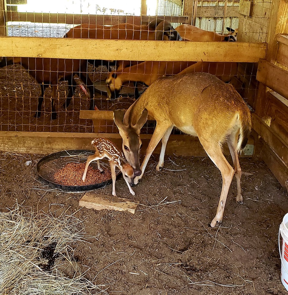 Sally Sue is a wild, whitetail doe, but she was bottle raised by my husband and myself. She knows that we are her safe place and that our barn is her home. She will always have food, water, and shelter there. She is free to leave as she pleases, but she always knows when to come home. I’m very pleased that she chose to come home to have her little fawn this time and that we were there to give it a little extra boost of nourishment to get it going.