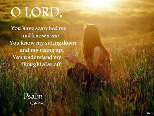 Psalm 139:1-6 You have searched me, Lord, and you know me. You know when I sit and when I rise; you perceive my thoughts from afar. You discern my going out and my lying down; you are familiar with all my ways. Before a word is on my tongue you, Lord, know it completely. You hem me in behind and before, and you lay your hand upon me. Such knowledge is too wonderful for me, too lofty for me to attain.