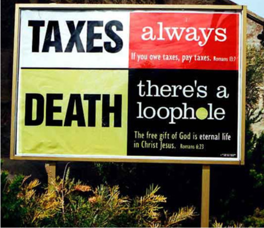 Get those taxes together in case Jesus doesn’t return by April 15, but even more important than those taxes, get yourself together today. Just remember this fact. If you owe taxes, you have to pay taxes, but with death there is a loophole. We have all sinned and fallen short of the glory of God, but the gift of eternal life is free! Jesus already paid the price. For the wages of sin is death, but the free gift of God is eternal life through Christ Jesus our Lord. (Romans 6:23) Make sure that you know where you will be spending eternity. You may have until April 15. You may have fifty years left on this earth. You may only have today. There is no better time than now to choose Jesus!
