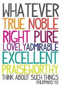 Philippians 4:8-9 And now, dear brothers and sisters, one final thing. Fix your thoughts on what is true, and honorable, and right, and pure, and lovely, and admirable. Think about things that are excellent and worthy of praise. Keep putting into practice all you learned and received from me—everything you heard from me and saw me doing. Then the God of peace will be with you.