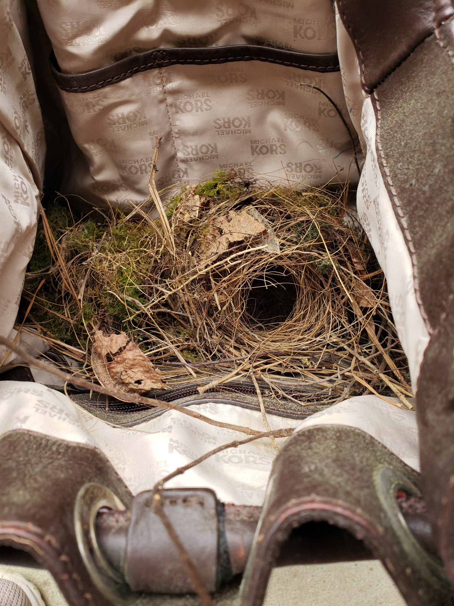 A little over a week ago, my friend was cleaning out her shed, and she gave me two purses: a Coach and a Michael Kors purse. They had been in storage for some time and smelled a little bit musty. I decided to hang them out on the back porch for a few days in the fresh air and “air them out a bit.” Well, I totally forgot about those purses until yesterday when I decided that I would bring them in and wipe them down. I took the Coach purse down from it’s perch, and I reached up to remove the MK purse from the hook that it was hanging on when I saw something in the bottom of the bag. It startled me at first until my eyes focused clearly on the object that was there. It was a bird nest! A perfectly shaped, perfectly formed bird nest. A busy little mama bird had poured her energy into the creation of this perfect little nest in my second hand Michael Kors purse. She has made the purse her home! There were no eggs there just yet, but trust me when I say that she has prepared her home and it is ready for the arrival of her kids.