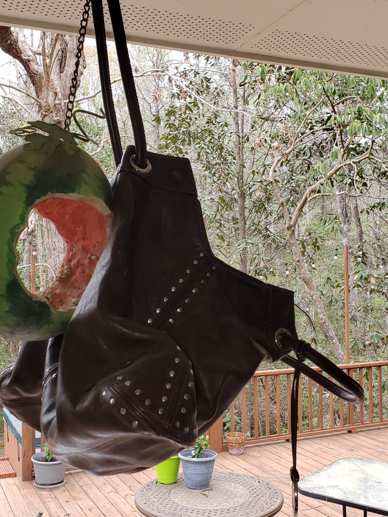 I have never purchased a Coach or Michael Kors purse in my life. The names don’t really mean anything to me, and I’d rather put my money in my bag instead of spending it buying a bag and not having any money left over to put in it, but that’s just me. It really made me laugh that this little bird has such high standards. I mean, I have beautifully painted gourds hanging in the trees for her to build her nest in. There are trees all over this eighty acres, but, no, not my little bird. She chose a Michael Kors purse for the home of her little ones. She set her standards high. She wanted her home to be perfect and a bit classy too. She apparently has a little more style than this girl.