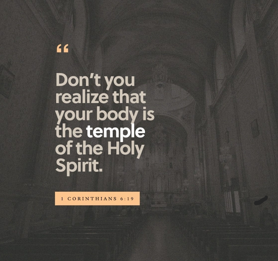 I Corinthians 6:19-20 Do you not know that your bodies are temples of the Holy Spirit, who is in you, whom you have received from God? You are not your own; 20 you were bought at a price. Therefore honor God with your bodies.