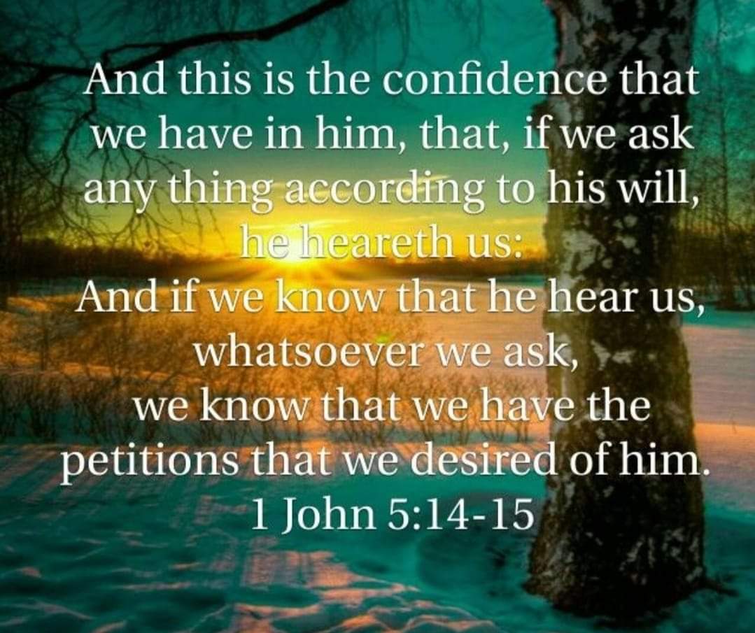 I John 5:14-15 This is the confidence we have in approaching God: that if we ask anything according to his will, he hears us. And if we know that he hears us—whatever we ask—we know that we have what we asked of him.