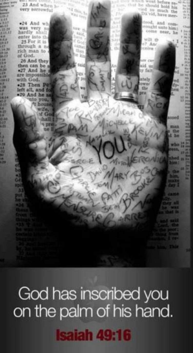 Isaiah 49:16 See, I have engraved you on the palms of my hands