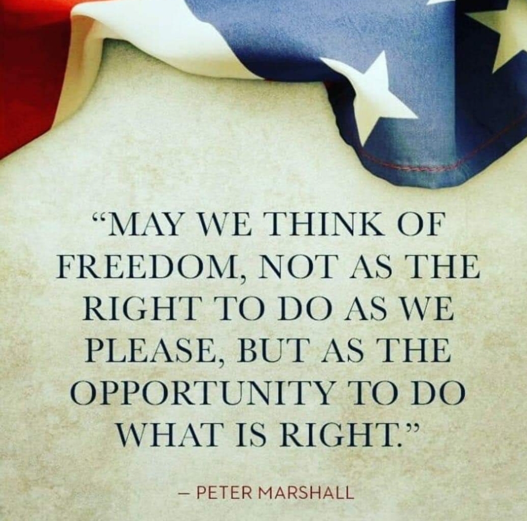 “May we think of freedom, not as the right to do as we please, but as the opportunity to do what is right.” (Peter Marshall) I read this quote after studying my Sunday School lesson for this week, and I found it to be very fitting. With Paul’s teachings to the Corinthians fresh on my mind, I couldn’t help but ponder our ideas of freedom.